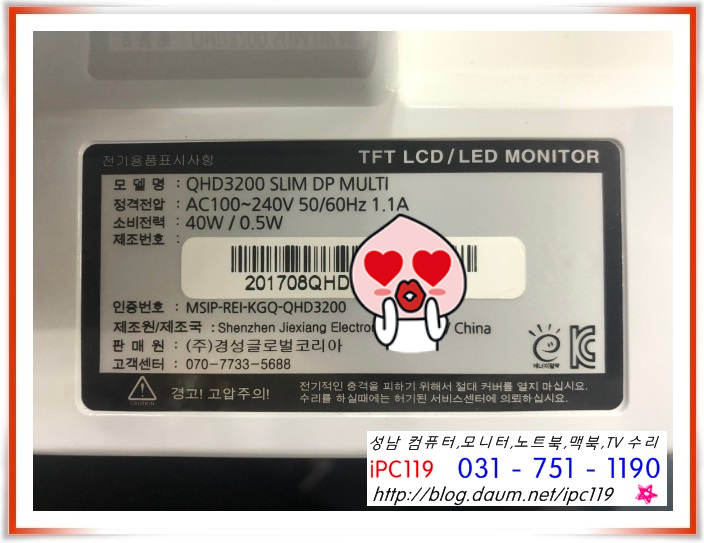 수리 문의 시에는 아래 사진과 같은 뒷 라벨을