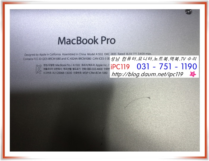 성남맥북수리, 맥북프로 MBP A1502 Early 2015 부팅이 안되요, SSD 교체 수리, 업그레이드