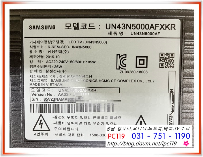 성남 광주 분당 판교 TV 수리, 삼성전자 UN43N5000AFXKR 화면이 안 나와요. UN43N5000AF