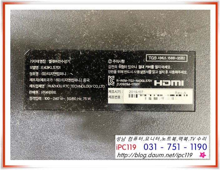 성남 분당, 위례 TV수리, 이마트 노브랜드 E43KL5701 화면이 안 나와요. ELECTRO MEN 일렉트로맨