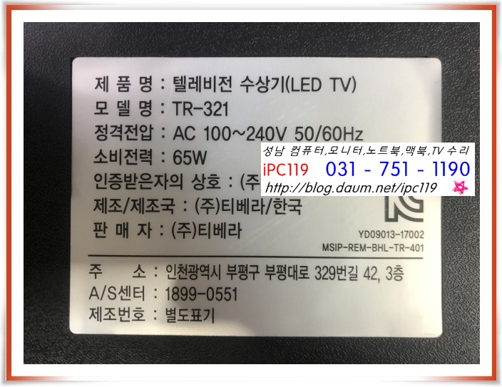 바로 앞 1층에 위치한 TV(컴퓨터) 수리점 iPC119입니다.