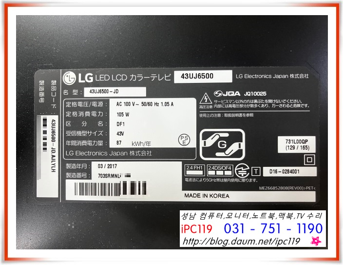 | 성남TV수리, LG전자 55UF6800 화면 반은 안 나오고 반은 깜박이는 증상, 백라이트 교체 (37) | 2025.01.06 |