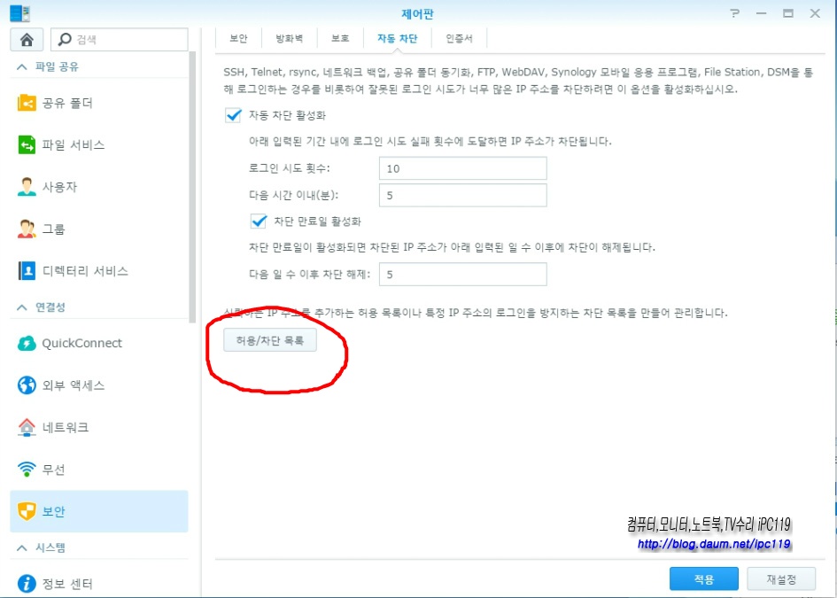 반대로 접속을 원하지 않는 IP는 차단 목록에 추가해주면 접속이 되지 안겠죠 ^^